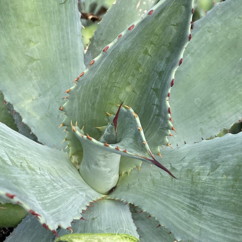 L'agave cuivré offre une rosette de taille moyenne (1 mètre de diamètre) composée de longues feuilles érigées bordées d'une très belle spination, le rendant particulièrement adapté à la culture en pot. Notre clone présente une couleur plus bleutée que le type. Ne rejette pas ou peu. Moyennement rustique.