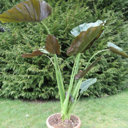 Alocasia très décoratif pour son grand et épais feuillage au revers violacé et aux nervures bien marquées, et très intéressant pour sa bonne rusticité malgré son origine : -12°C. Vente en pot de 5 litres, 40/50 cm en saison.