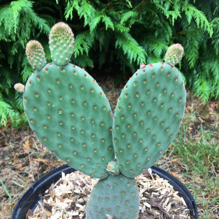 Opuntia de l'Arizona très intéressant pour sa taille moyenne (60/70 cm), pour son absence d'épines et pour sa robustesse (plus facile que son cousin proche microdasys). -15°C. Petits glochides rouges décoratifs et belle floraison jaune brillant.