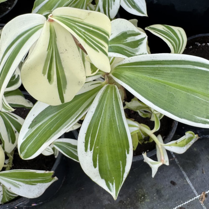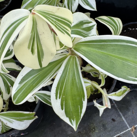 Connu aussi sous le nom de Costus amazonicus variegata, ce gingembre très graphique offre un feuillage très lumineux panaché de blanc, avec des feuilles toutes différentes les unes des autres et un port original en spirale, justifiant son surnom de gingembre spirale panaché. Plus petit que le type, cette forme peut atteindre 1 m 50 de haut.