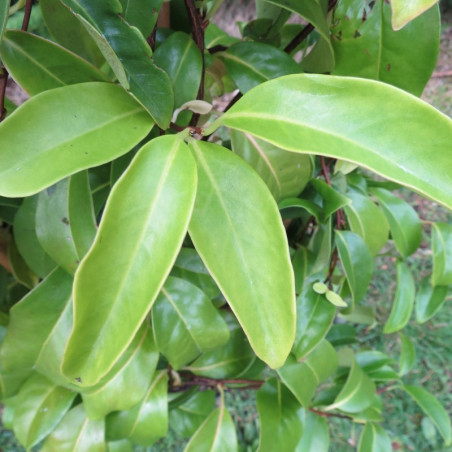 Grimpante japonaise persistante originale pour son feuillage ovale vert, épais, brillant et rougissant à l'automne, et pour ses petites fleurs solitaires en clochettes pendantes jaune clair tout l'été suivies de baies rouges. -15°C. Vente en pot de 5 litres, sujets très forts d'1 mètre de haut.