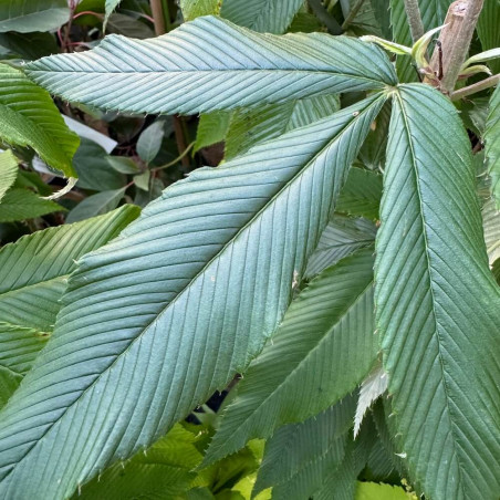 Ronce sans épines endémique des contreforts himalayens où elle pousse en zones boisées jusqu'à 3000 m d'altitude, spectaculaire et très graphique par ses grandes feuilles nervurées au revers argenté, portées par de longues tiges également argentées, retombantes, pouvant mesurer 3 mètres de long. Ce rare hybride se distingue du type par des feuilles trifoliées. Assez rustique en zone protégée : -10°C. Une ronce sympathique ! Vente de grands sujets d'1 m 20 de haut, en pots de 3 litres.