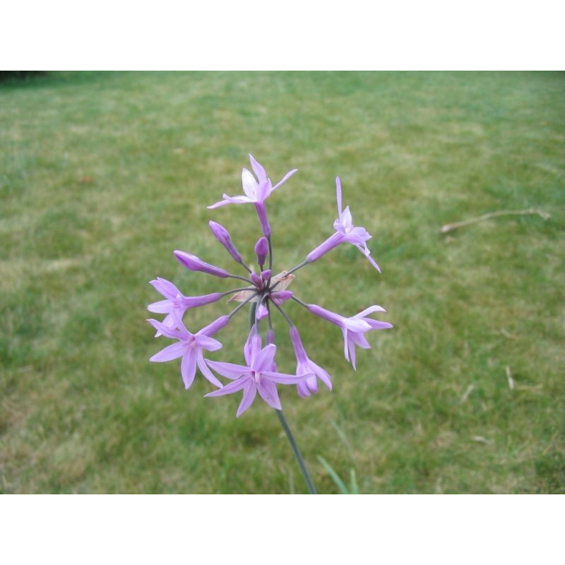 Vivace à feuillage panaché et fleurs lilas comestibles, au goût d'ail. -8°C. Vente en pot de 3 litres.